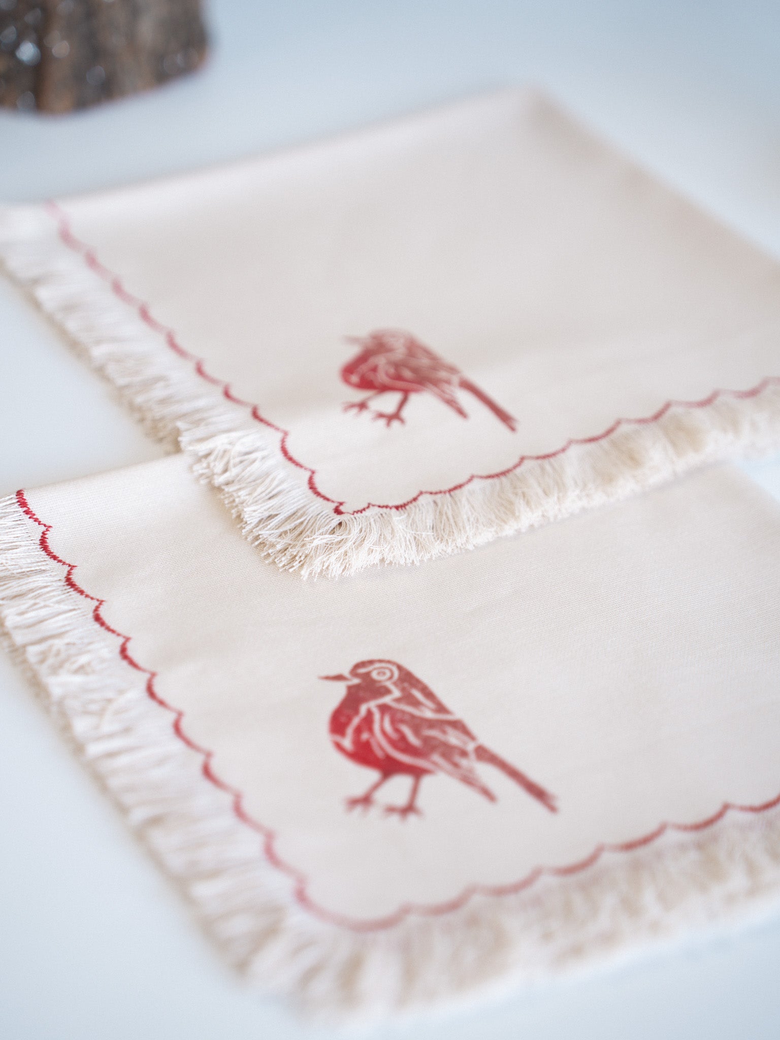 Each napkin is hand-printed using traditional wooden blocks, creating subtle variations that make every piece truly one of a kind. Made from soft, durable cotton and finished with delicate fringed edges, they add a natural, handmade elegance to any setting.