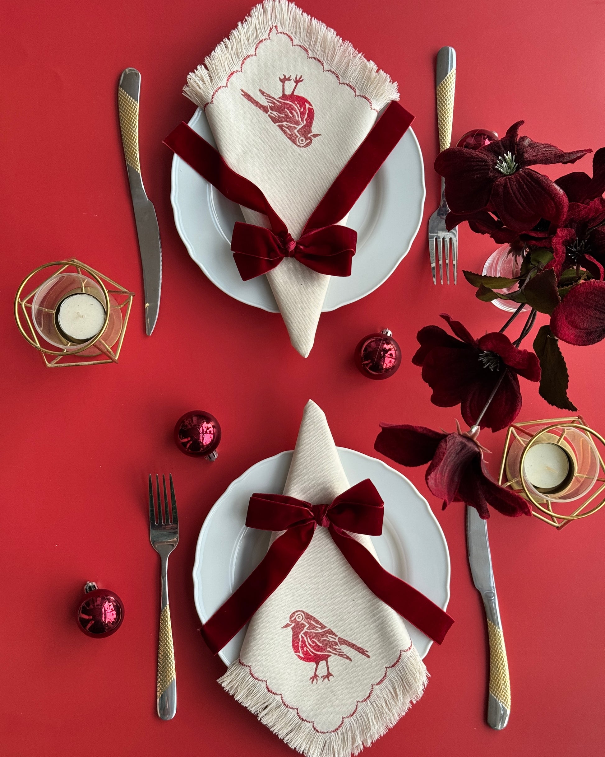 Bring festive charm and artisanal beauty to your holiday table with our cotton block-printed fringed napkins.